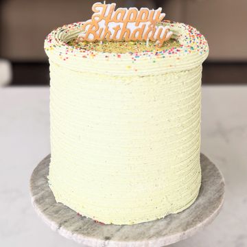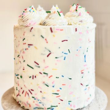 8" Moist vanilla cake loaded with colorful sprinkles and silky vanilla buttercream.