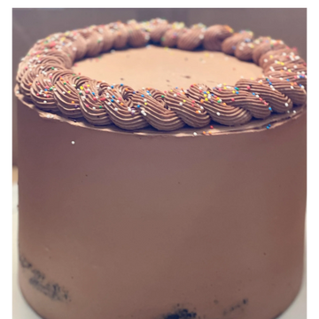 8" Moist dark chocolate cake, layered with whipped chocolate mousse and finished in a smooth chocolate buttercream. Sprinkles upon request.